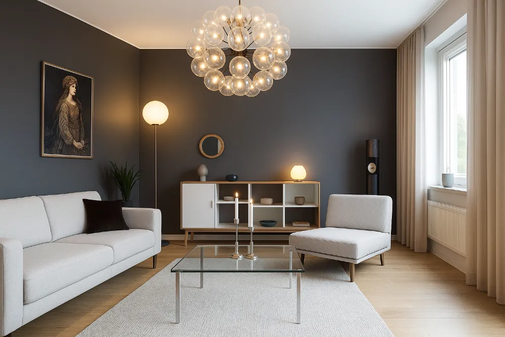 У вітальні важливо досягти гнучкості. Основне світло може забезпечити люстра або декоративний підвіс, а доповнювати атмосферу мають бра, настільні лампи чи торшер. Вони створюють локальні острівці затишку й дають змогу змінювати настрій кімнати без зайвих зусиль. Добре, якщо є можливість регулювати яскравість — це дозволяє плавно переходити від активного освітлення до розслабленого вечірнього.