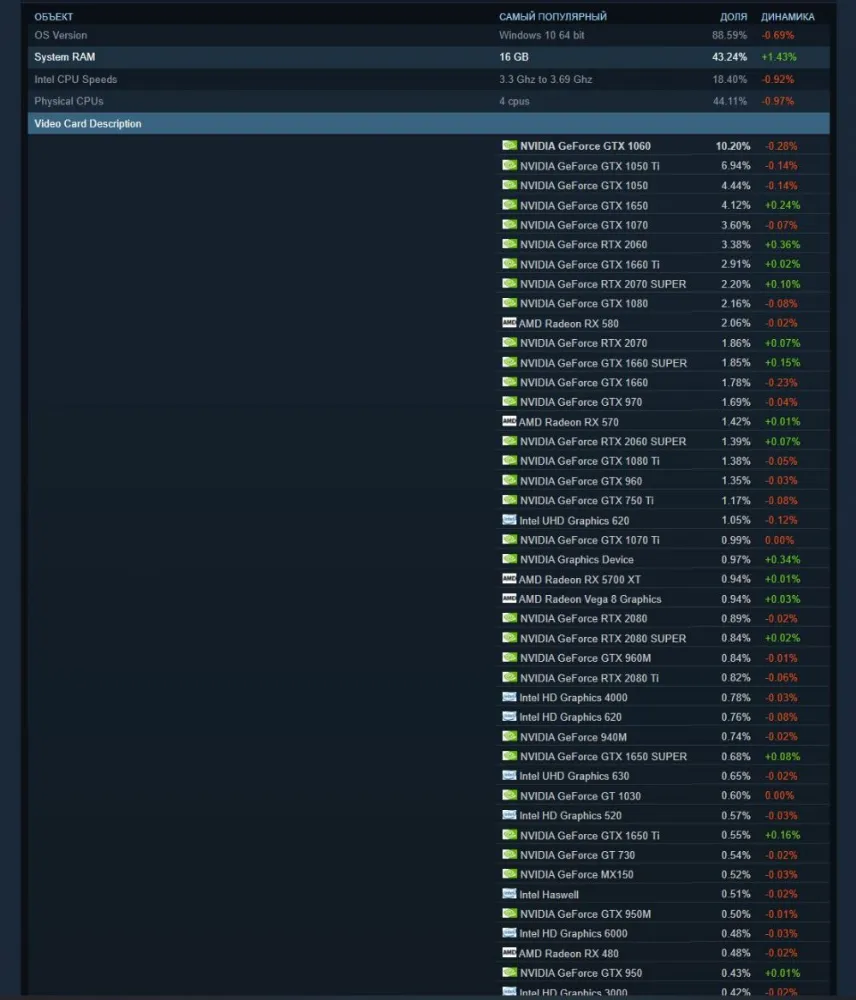 На другому місці GTX 1050 Ti, яка свого часу вважалася королевою бюджетного цінового сегмента. Уже вийшло 2 нових покоління, а бабуся все ніяк не поспішає на спокій. Можливо, саме тому Дженсен Хуанг на вересневій презентації відеокарт RTX 30 Series сказав фразу «Всі мої друзі, які використовують Pascal! Зараз прийшов час оновитися ». Ця ситуація як ніщо інше підтверджує тезу, що епоха відеокарт Nvidia GeForce GTX 10 Series була в якомусь сенсі золотою для ігрової індустрії. Але час іде, й топові відеокарти тих часів уже не справляються з сучасними відеоіграми, тож Хуанг правий. Прийшов час рухатися далі.